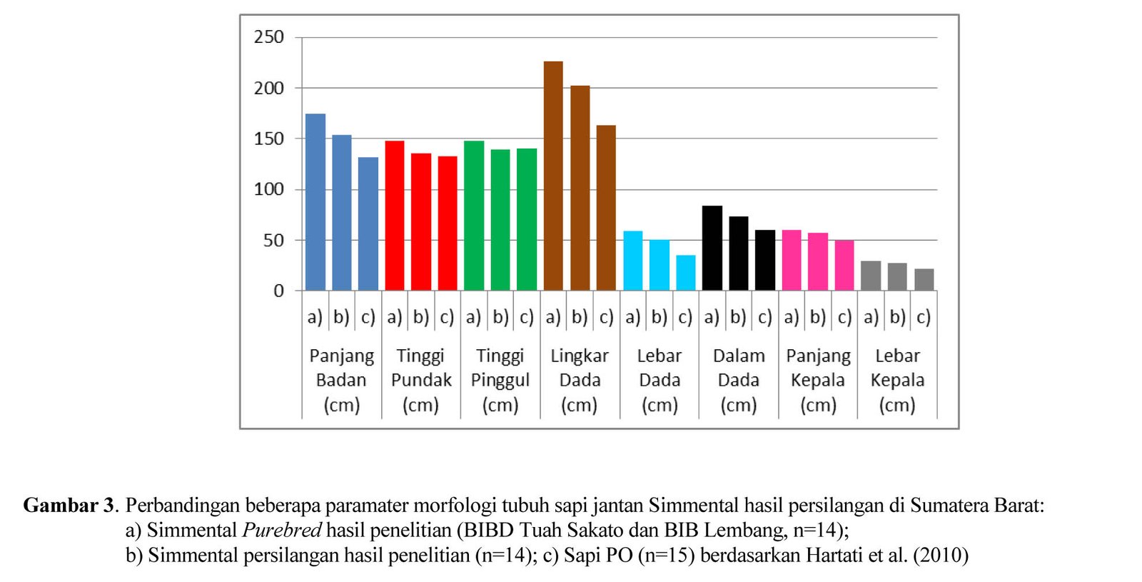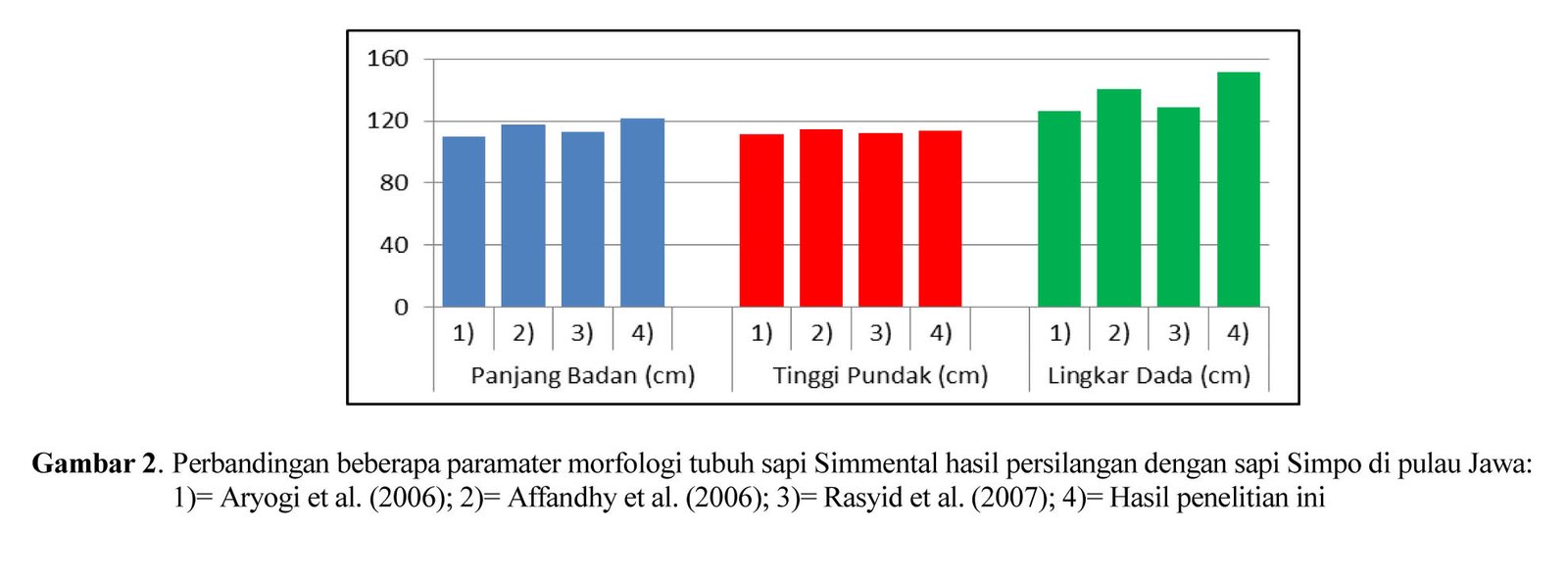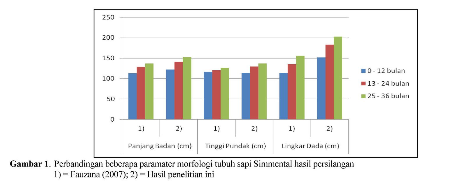Hasil penelitian yang menunjukkan data morfologi sapi Simmental di Sumatera Barat tidak cukup banyak, namun bila dilakukan perbandingan, ukuran parameter tubuh sapi jantan Simmental hasil persilangan dalam penelitian ini relatif lebih besar bila dibandingkan dengan sapi jantan Simmental hasil persilangan di daerah lain di Sumatera Barat seperti yang dilaporkan oleh Fauzana (2007) (Gambar 1).