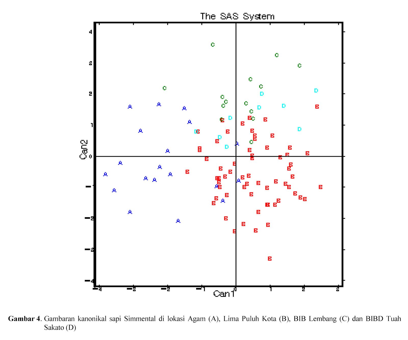 Hasil analisis pada Gambar 4 memperlihatkan adanya pengelompokkan sapi Simmental secara morfologis. Diketahui bahwa sapi Simmental hasil persilangan subpopulasi Agam dan Lima Puluh Kota menyebar di semua kuadran (I-IV) sementara itu sapi Simmental purebred subpopulasi BIB Lembang dan BIBD Tuah Sakato menyebar hanya di kuadran I dan II.
