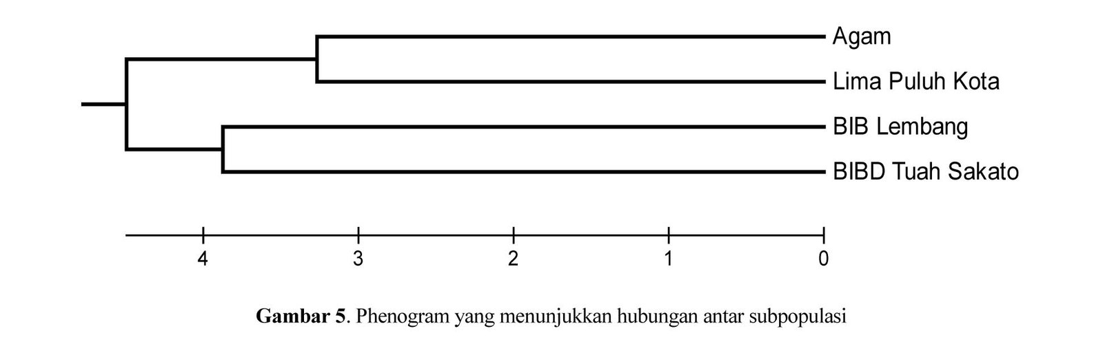 Hasil estimasi hubungan kedekatan morfologi menggunakan jarak Mahalanobis (Mahalanobis Distance) disajikan dalam Tabel 5. Berdasarkan hasil estimasi hubungan kekerabatan menggunakan jarak Mahalanobis diketahui bahwa jarak terbesar adalah antara subpopulasi Agam dengan BIBD Tuah Sakato sedangkan jarak terkecil adalah antara subpopulasi Agam dengan Lima Puluh Kota.